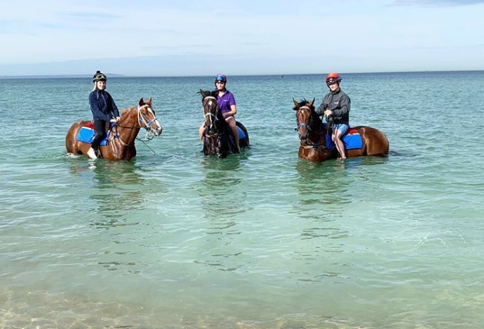 Auch Django Freeman musste nach seiner Ankunft in „down under“ einen Stopp einlegen. Doch mittlerweile sind beide Galopper wieder im Training. Und dies findet nicht nur auf der Rennbahn statt. Gemeinsam mit Blenders Edition arbeiteten Django Freeman und Schabau am Strand. Inklusive einer kleinen Abkühlung im Meer.