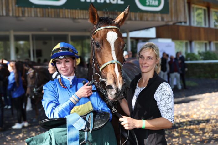 Dabei ließ die für das Gestüt Niederrhein trainierte Waldpfad-Tochter zunächst in hinteren Regionen galoppieren, um dann in der Geraden mit viel Speed fast am gesamten Feld vorbei zu fliegen. „Ich habe sie hinter den Pferden etwas schlafen lassen und auf ihren Speed gehofft. Sie kam dann innen ganz leicht durch“, gab es von der Siegreiterin nach dem Rennen viel Lob für ihre Partnerin.