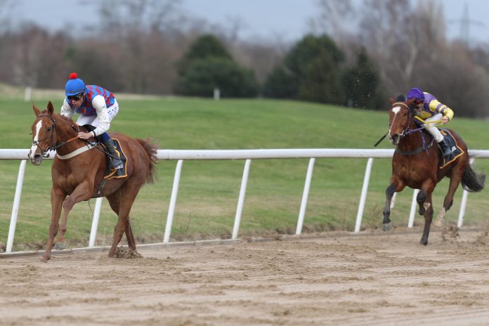 Zehn Pferde waren für die Auftaktprüfung in Dortmund-Wambel, ein mit 3.000 Euro dotiertes Altersgewichtsrennen über 1800 Meter, am Mittwoch in die Startboxen eingerückt. Den Sieg machten am Ende die drei Favoriten unter sich aus.