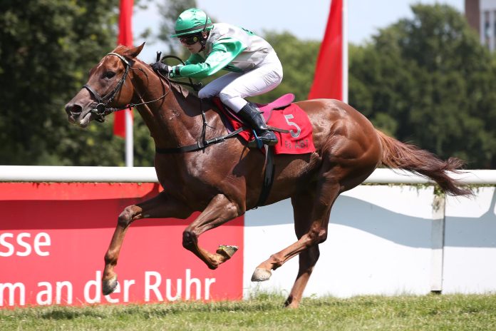 Während der Favorit Seewolf schon früh Notsignale sendete, marschierte Giolino unter Ester Ruth Weißmeier immer weiter und gewann das zweite Rennen in Folge. Bruce Hellier ist in Mülheim/Ruhr der Siegtrainer für den Stall Heberingshof (Zum Video).