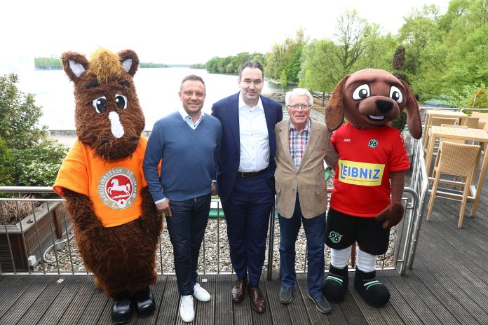 Das Foto zeigt die beiden Vereinsmaskottchen mit Hannover 96-Trainer Andre Breitenreiter, Gregor Baum und Hans-Jürgen Gröschel.