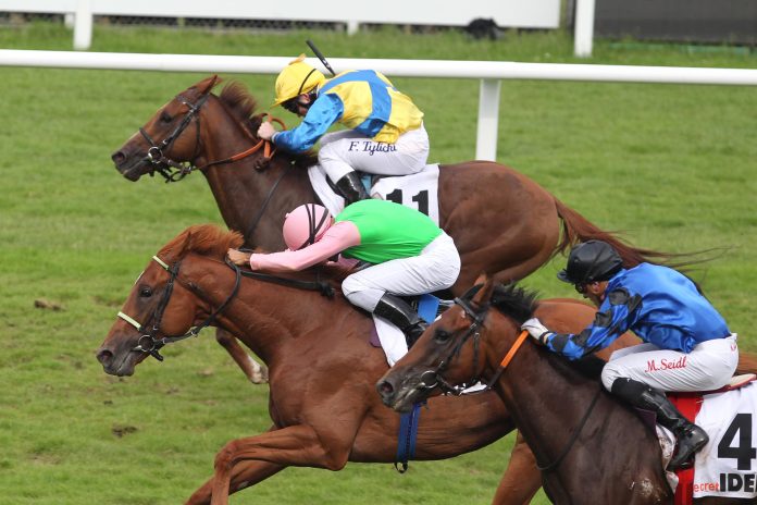 Das Finish war vor 18.000 Zuschauern spannungsgeladen, es riss das Publikum von den Sitzen, ein Kopf und ein Hals waren es im Ziel zwischen Isfahan, Savoir Vivre und Dschingis Secret (Zum Video).