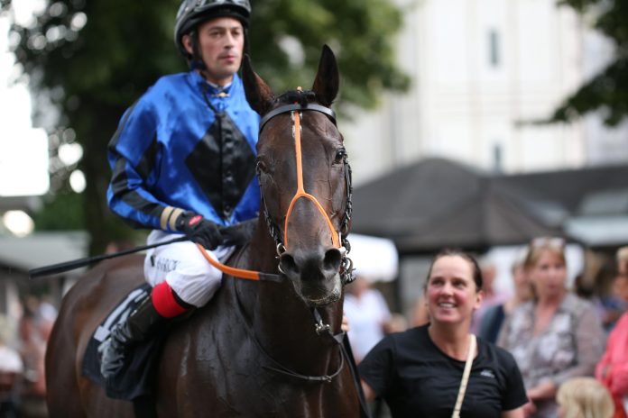 Narita gleich zu Beginn in den Farben von Erich Lenz bestätigte die große Form der Eheleute Sarah und Alexander Weis in diesem Jahr. Es war bereits der dritte Saisonsieg der sechsjährigen Stute (Video ansehen)“>Zum Video).