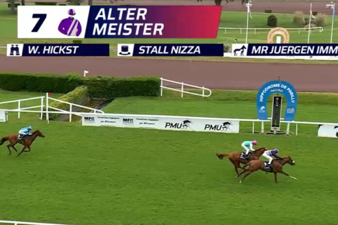 Schöner Erfolg für den Stall Nizza und Trainer Waldemar Hickst am Montag in Lyon-Parilly. Denn auf dem Linkskurs gab der mit einer Derby-Nennung ausgestattete Dreijährige Alter Meister ein erfolgreiches Debüt. Der Sohn des Etzeaner Deckhengstes Japan setzte sich mit Augustin Madamet im Sattel als 8,4:1-Chance in einem mit 19.200 Euro dotierten Maidenrennen über 2000 Meter gegen sieben Gegner durch.