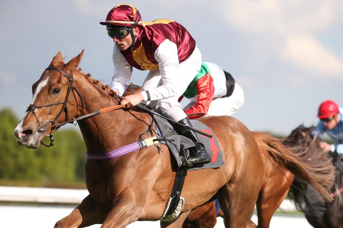 Mit dem Sieg eines Handicap-Debütanten begann am Dienstag der PMU-Renntag im Weidenpescher Park. Dr. Andreas Boltes Elmarani (70:10, Alexander Pietsch) gab ihren Einstand im Ausgleich IV (1600 m) und verwies nach einer starken Leistung das Peterschmitt-Duo um den lange führenden Miami Gator und Toulio auf die Plätze. „Er ist ein großer Kämpfer“, sagte Jockey Dennis Schiergen eine halbe Stunde später bei der Siegerehrung. Gerade hatte er mit Erika Mäders Dreamworks (39:10) das mittlere Handicap über 1850 Meter gewonnen. Die Trainerin aus Krefeld war natürlich hochzufrieden, denn auf Rang zwei landete mit dem siebenjährigen Big Shuffle-Sohn Feather Storm, den sie selbst gezogen hat, ebenfalls ein Pferd aus ihrem Stall (Video ansehen)“>Zum Video).