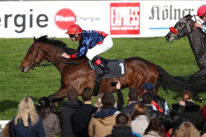 Im letzten Rennen des Tages gab es dann noch einen waschechten Kölner Heimsieg zu bejubeln. Der für den Kölner Rennvereinspräsidenten und von Peter Schiergen vor Ort trainierte Aufsteiger (18:10) siegte leicht in einem Sieglosenrennen für dreijährige Pferde über 1400 Meter.